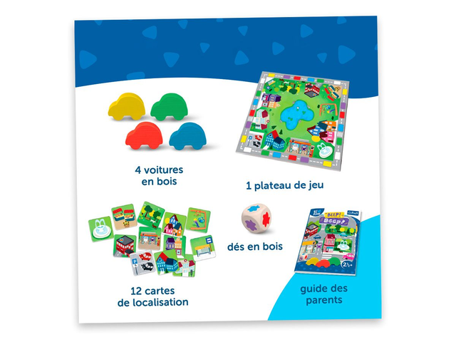 Contenu : un plateau, 4 voitures en bois, 12 cartes « passager », un gros dé en bois et un guide pour accompagner les parents. Une excellente idée de cadeau pour partager des moments de jeu simples, amusants et stimulants en famille.